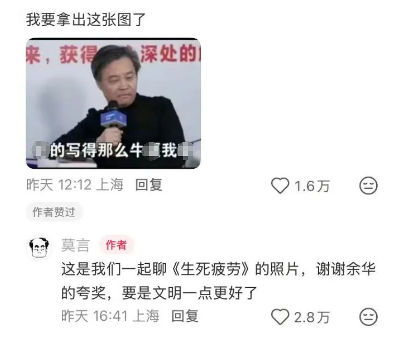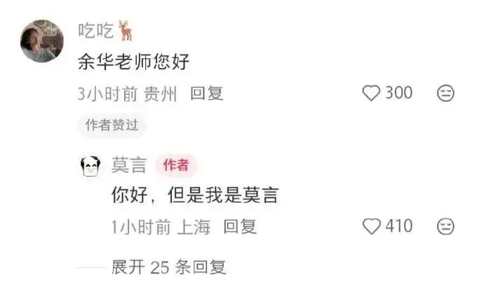 有网友打招呼:余华老师您好!莫言回复:你好,但是我是莫言。