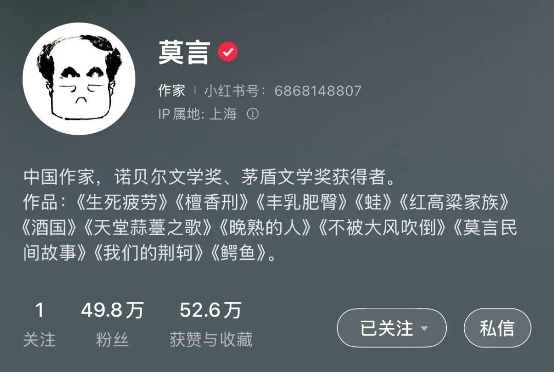 目前,莫言的账号信息显示,他一天收获粉丝50.6万,发布一条视频作品,获得50万点赞。