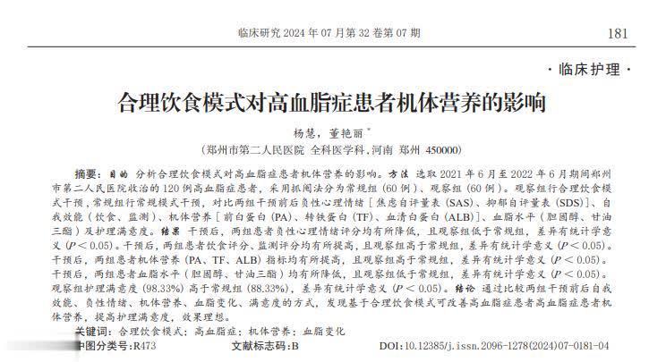 参考资料[1]杨慧.合理饮食模式对高血脂症患者机体营养的影响, 临床研究, 2024-07-10