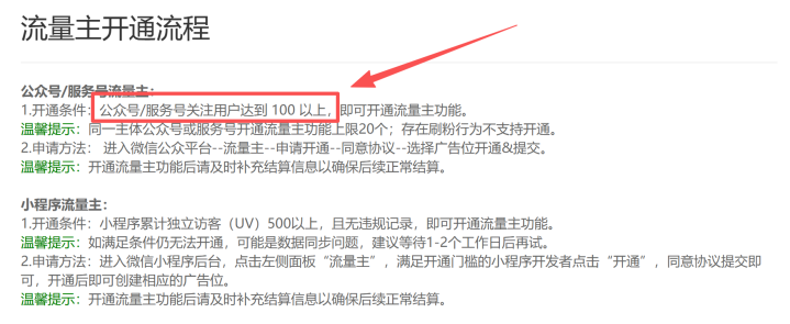 曾几何时,成为公众号流量主是顶级运营者的专属权益,粉丝数必须达到万级才能初窥门槛,但随着近年来自媒体的发展,公众号对流量主的门槛也逐步降低,从最早的10万粉,逐步降低到5万粉、2万粉、5000粉、500粉,直至现在的100粉,普通人通过自媒体变现的机会越来越触手可及了。