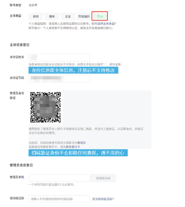 4、账号的「主体类型」选择「个人」,随后根据页面提示,输入姓名、身份证号信息