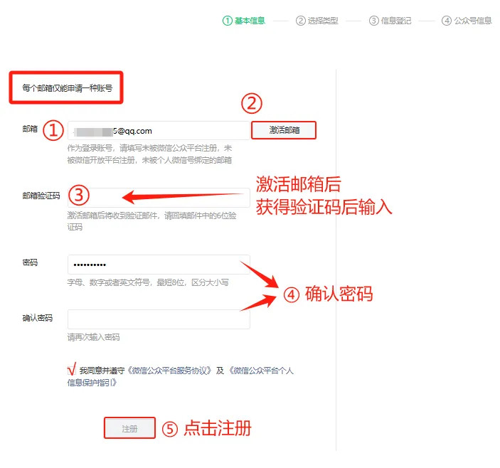 3、根据页面提示,输入邮箱地址、邮箱验证码、账号密码等信息,注意:需要先输入邮箱地址,点击「激活邮箱」后,登录邮箱才能查收邮箱验证码