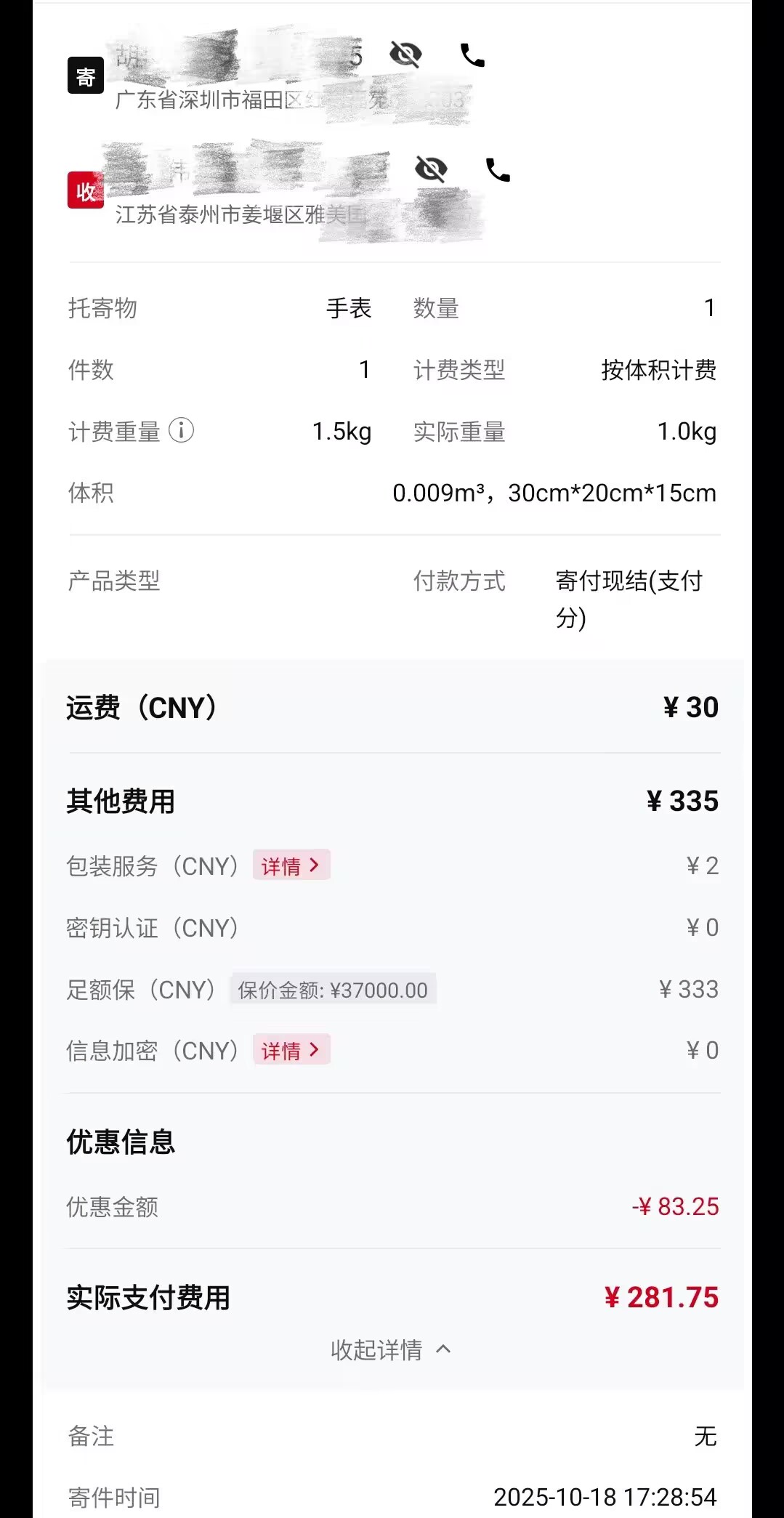 手表丢失后,快递公司工作人员联系罗先生商谈理赔事宜,“333元的保费,足额理赔下来只有3.7万元,一只表只赔1.85万元。我的表是花了40万买的,这个方案我肯定无法接受”。