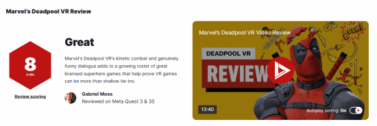 总评称,这款游戏通过充满张力的战斗系统让玩家在10小时主线流程中全程投入,各具特色的平行宇宙死侍版本搭配令人会心一笑的专属台词,使重复闯关充满乐趣,而非单纯堆砌时长。尼尔·帕特里克·哈里斯的配音演绎完美契合角色预期,真人秀式叙事框架非但不显突兀,反而增强了整体剧情表现。如果你喜欢黑色幽默与打破第四面墙的喜剧元素,这无疑是自《蝙蝠侠:阿卡姆之影》以来最完整、最有趣的超级英雄VR体验。确保用Quest 3设备游玩,才能充分体验其绚丽的视觉效果。