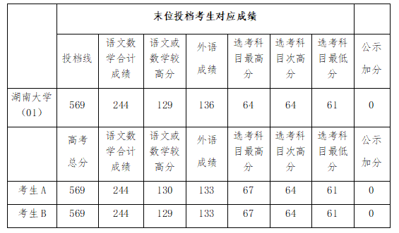 考生A的语文数学合计成绩244分与湖南大学(01)末位投档考生成绩相同,语数单科较高成绩130分高于湖南大学(01)末位投档考生的129分,故考生A被成功投档至湖南大学(01)。