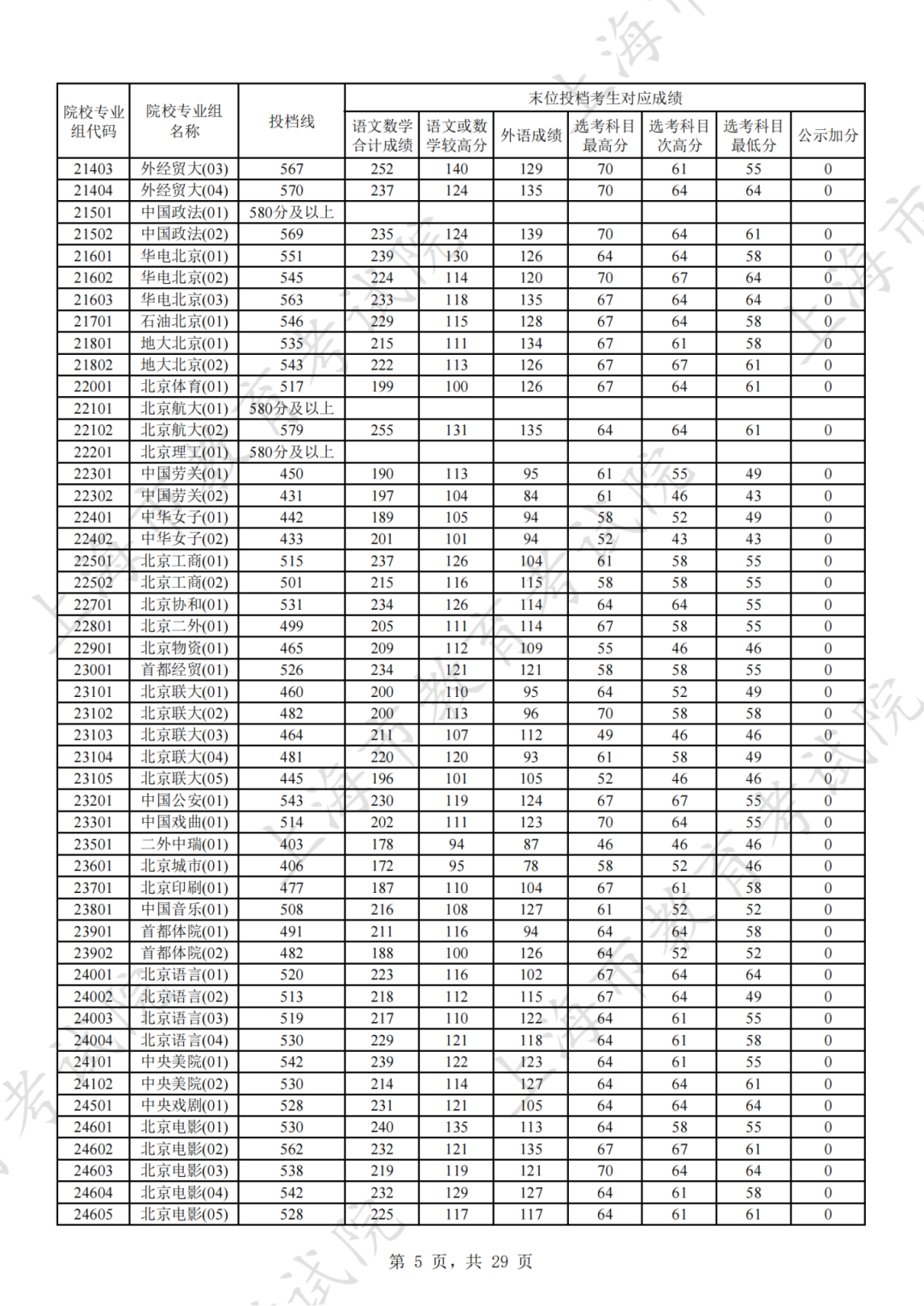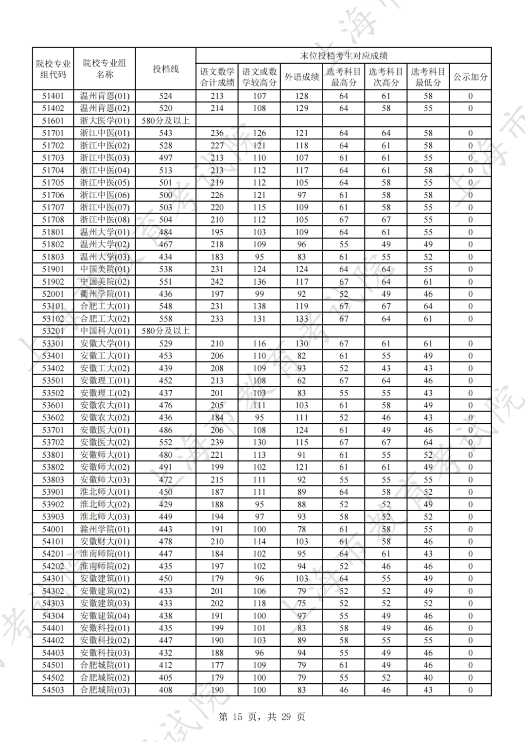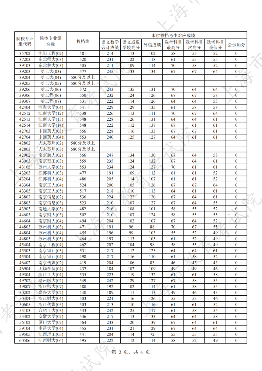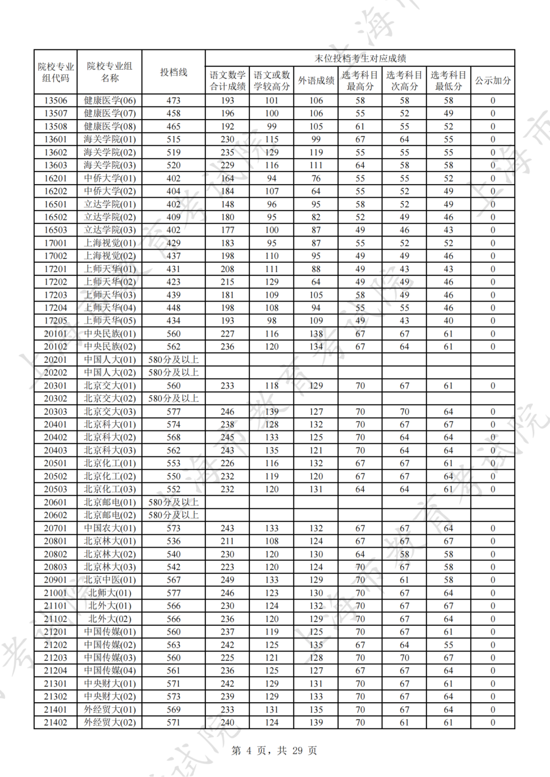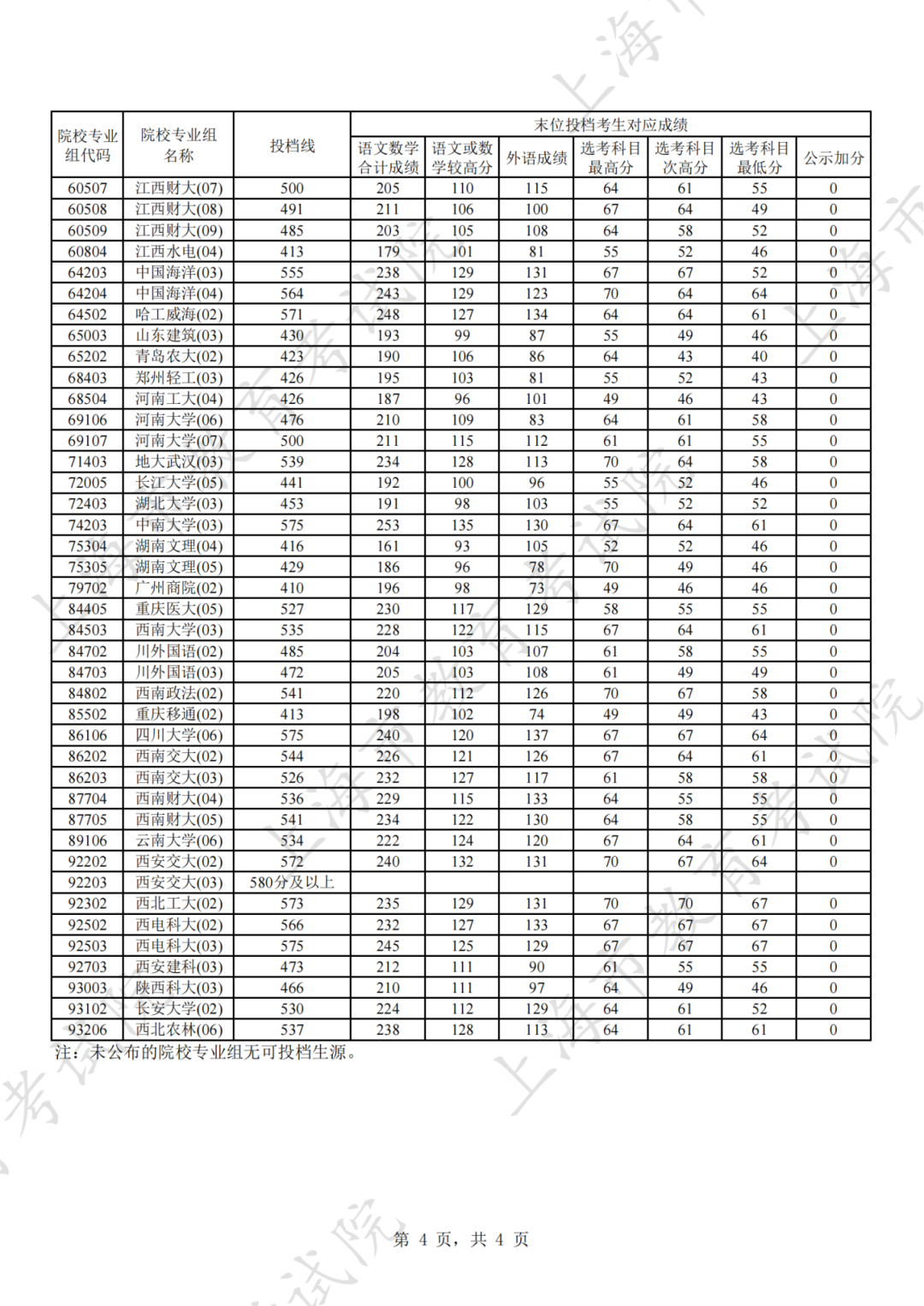 为贯彻落实教育部关于做好普通高考招生录取工作的有关要求,积极营造尊重考生兴趣选择的良好导向,避免发生炒作高分段考生投档情况等现象,投档分数线在580分及以上的院校专业组不公布具体分数。参与本科普通批次投档且高考成绩在580分及以上考生的投档信息将由市教育考试院会同相关中学逐一告知考生。