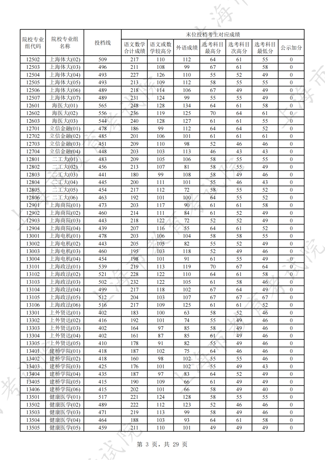比如某考生高考成绩为575分,则他应根据自己填报的院校专业组志愿顺序进行比较,若考生填报的志愿顺序依次为上海财经大学(03)[投档线576分]、山东大学(03)[投档线577分]、上海外国语大学(05)[投档线570分]…… 其中,1至2志愿投档线都高于考生成绩,第3志愿投档线低于考生成绩,则考生被投档到第3志愿上海外国语大学(05),不会再看考生填报的后序志愿。