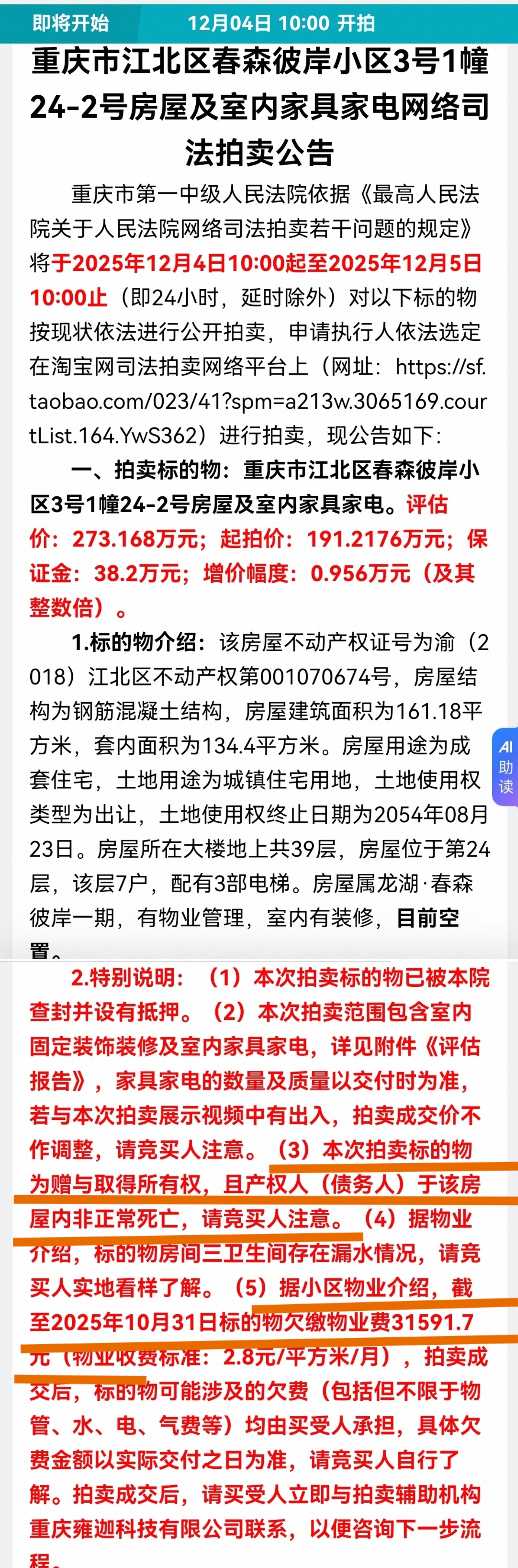 近日,重庆市区内一套房产在阿里法拍平台上线拍卖,起拍价约191万元。法拍公告特别提示,该房屋产权人(债务人)曾在屋内非正常死亡,且目前已欠缴物业费超3万元。拍卖成交后,房屋涉及的所有欠费均由买受人承担。