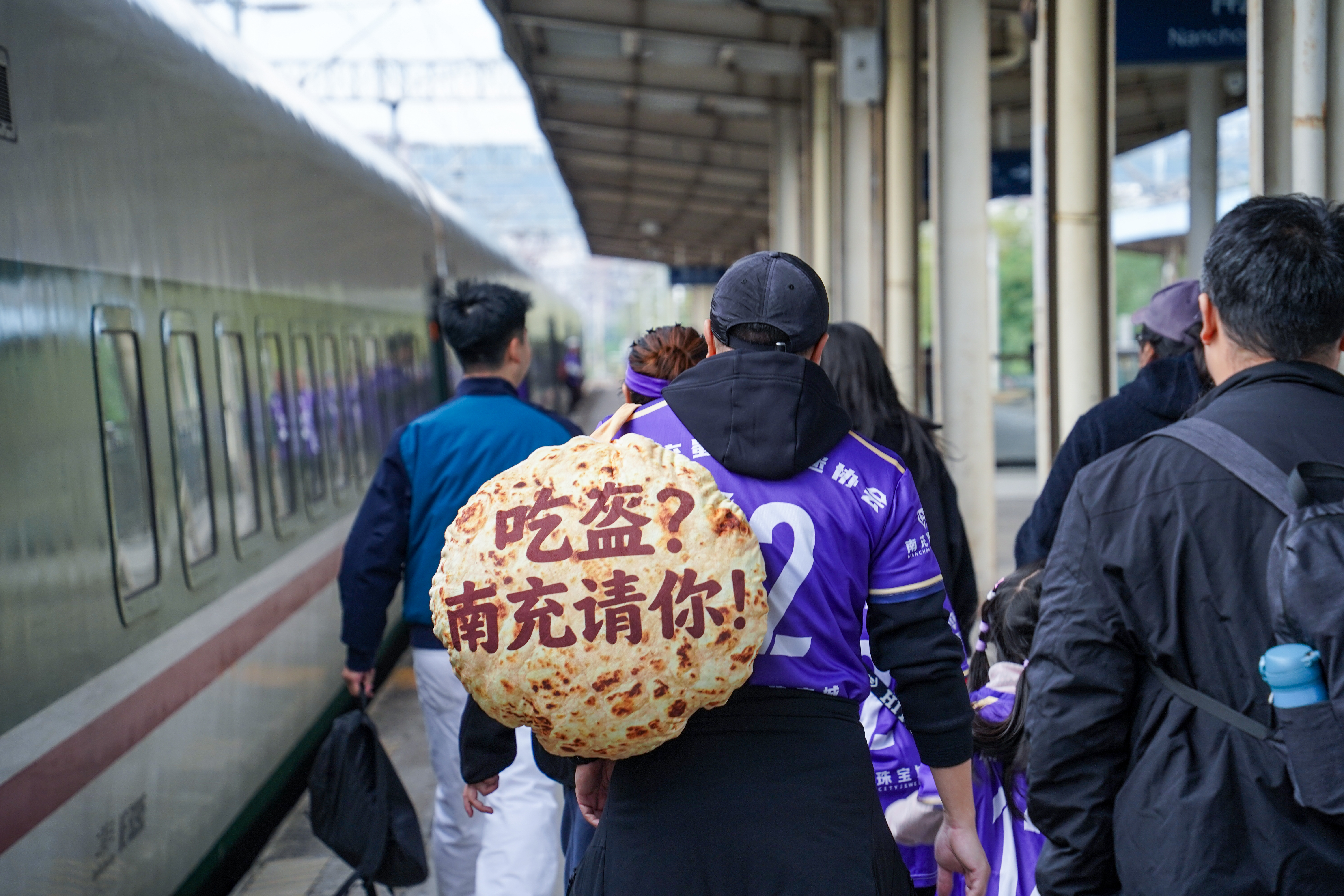 在南充车站,1200名身着紫色助威服的球迷在候车室里形成一片紫色的人海,他们身背“吃盔?南充请你!”文创产品前往达州为川超比赛“摇旗呐喊”。